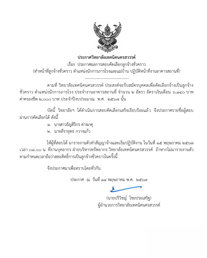 ประกาศวิทยาลัยเทคนิคนครสวรรค์ เรื่อง ประกาศผลสอบการคัดเลือกลูกจ้างชั่วคราว